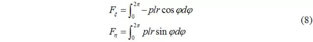 將微面積上力沿偏心方向及垂直方向兩個分量依次積分,即得油膜壓力的合力的兩個分量如圖1所示。