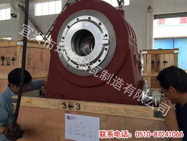 瓦塊上的銷釘孔設(shè)在違背基地7.54mm處,因而瓦塊的工作面和推力盤之間就構(gòu)成了楔形空隙。當(dāng)推力盤滾動(dòng)時(shí)油在楔形空隙中遭到揉捏,壓力提高,因而這層油膜上具有接受轉(zhuǎn)子軸向推力的才能。裝置環(huán)安頓在球面座上,油通過節(jié)流孔送入推力軸承進(jìn)油室,分為兩路經(jīng)推力軸承球面座上的進(jìn)油孔進(jìn)入主軸周圍的環(huán)形油室,并在瓦塊之間徑向流過。在瓦塊與瓦塊之間留有寬敞的空間,便于油在瓦塊中循環(huán)。